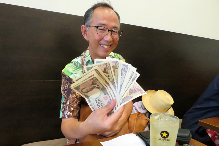 札びら見せびらかしてますが、御徒町のさる店で金の延べ棒を売ってきたそうです(嘘)。ここで初めて渋沢の栄ちゃん、お目にかかりました。え?本日は全員分ゴチに?さすがは富豪です。