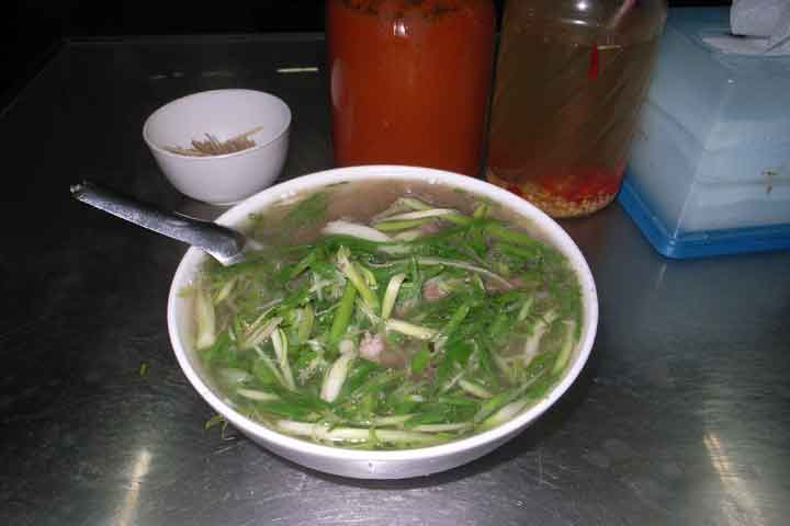 こちら、ハノイで食したフォーボー(牛肉フォー)。大量のワケギに隠れてめんと牛肉が見えません。