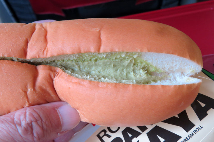 「Pandan」が「パンダンの葉」のことです。「Kaya」は直訳で「豊かな、金持ちの」という意味ですが、旧英領マラヤ発祥のジャムのことでもあり、ココナッツが原料です。このパンのカヤはパンダンリーフを色付けに使っていて、淡い緑色のジャムということになります。